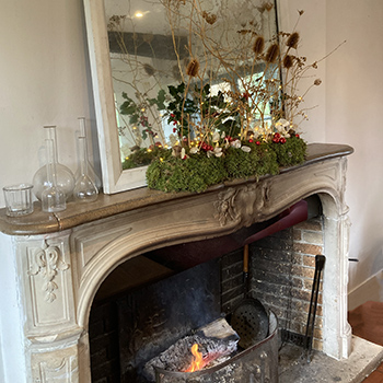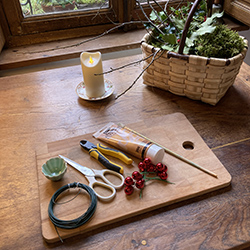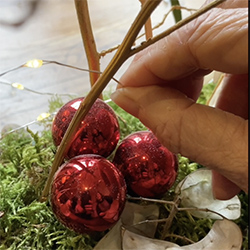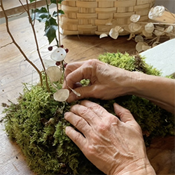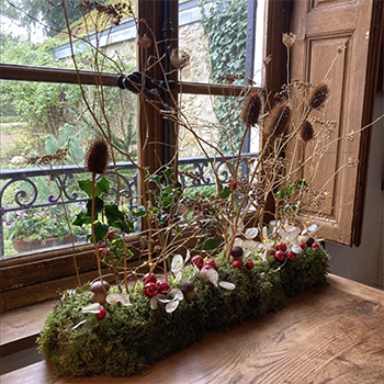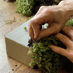 5. Placez ensuite les branchages et feuillages trouvés dans les vois en les piquant dans le bloc de mousse.