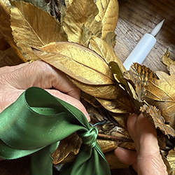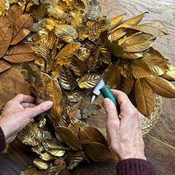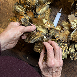 9. Positionnez vos différents feuillages en les superposant un peu et en les fixant avec le fil de coton qui vient s'enrouler progressivement autour des branchettes. Tournez progressivement afin de faire le tour entier de la couronne.