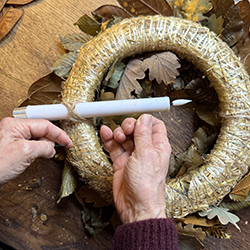 6. Fixez la bougie à votre couronne de paille en croisant la ficelle de jute plusieurs fois avant de faire un noeud.